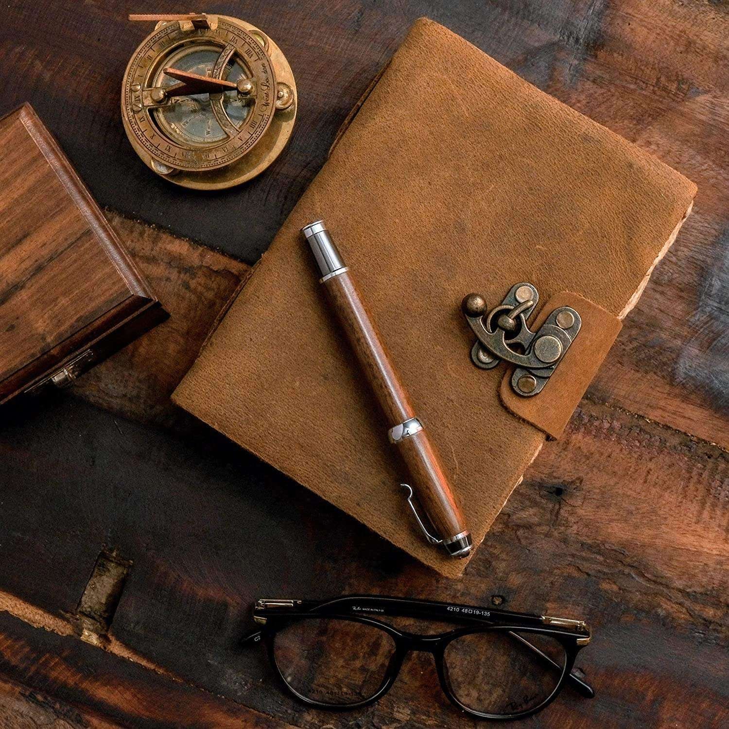 vintage handmade leather journal. Crafted with genuine leather, it radiates authenticity and charm, perfect for those who appreciate classic craftsmanship. The premium antique lock closure adds a touch of elegance and security, ensuring your thoughts and memories are safeguarded within its pages. Inside, you’ll discover 200 brown handmade pages, providing ample space for your musings, sketches, and stories to unfold. Whether it’s for journaling, sketching, or planning, this versatile journal is a timeless companion for your creative endeavors. Treat yourself or a loved one to this exquisite piece, a celebration of tradition and creativity