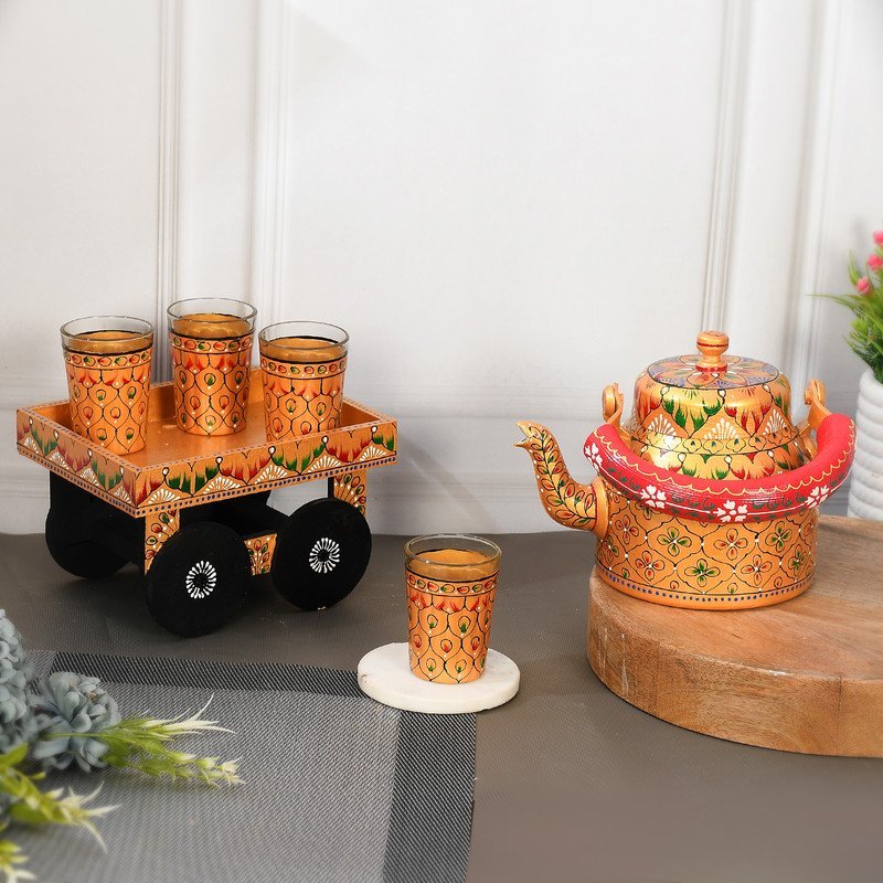 HandPainted Alluminium Tea Kettle with Four Glasses and Wooden Tray For Home Décor , Tea Party , Serving