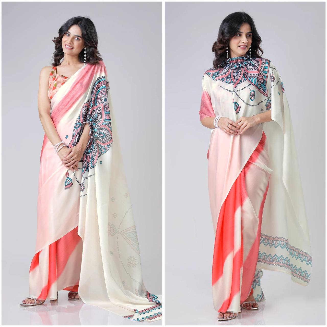 Women’s Modern Dual-Tone Peach & Off-White Satin Silk Kaftan Saree with Digital Print Neck Design