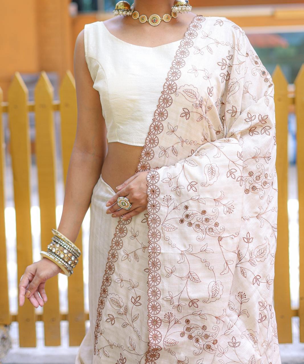 Drape yourself in luxury with this Pure Soft Silk Saree, exquisitely adorned with beautiful thread handwork. It showcases an elegant floral design complemented by a sophisticated cutwork border, creating a harmonious and graceful look. The saree features this elegant design meticulously spread all over, ensuring a stunning appearance. This timeless piece, perfect for any special occasion, is available for ₹4,899.00.